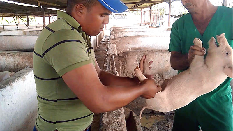“Aquí hay pasión por los animales, eso te lo puedo asegurar”, dice y se detiene frente a un grupo de cerdos que lo miran con curiosidad, como si esperaran que le diera comida. Pero no. Junto al responsable de la pequeña unidad, agarra uno y otro cerdito y lo examina, lo vacuna en medio de chillidos que amenazan a los tímpanos.