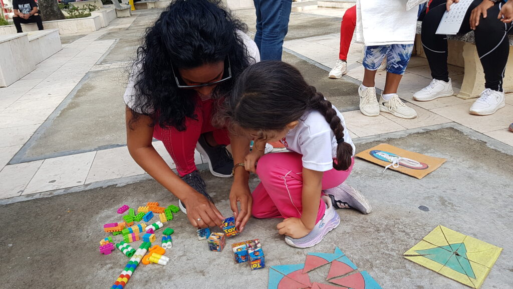 Las imágenes muestran cómo niños y adultos participan en actividades educativas y recreativas: juegos con bloques geométricos, dinámicas de coordinación y deportes, así como presentaciones culturales y espectáculos de payasos que animan el ambiente.